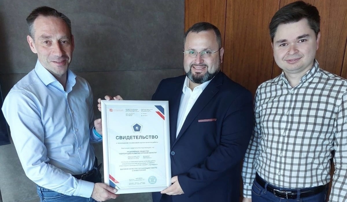 Сертификат гендиректору Корпорации развития Курской области Владимиру Лукину вручили исполнительный директор НААИР Рафаэль Хусяиншин и председатель правления НААИР Сергей Беляков.