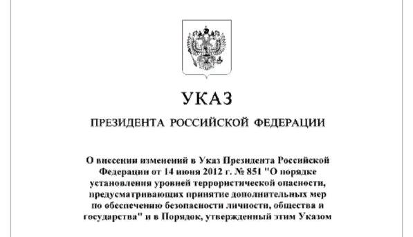 После подписания документа указом исключен срок в 15 суток, на который устанавливается уровень террористической опасности.