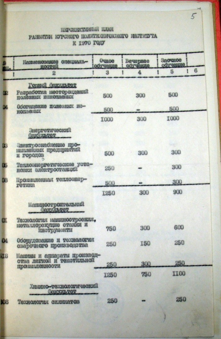 Кроме того, в плане было зафиксировано число студентов, которое Курский политехнический институт готовился принять к 1970 году. Предполагалось зачисление 6100 человек на дневную форму обучения, 3000 – на вечернюю и 5500 – на заочную.