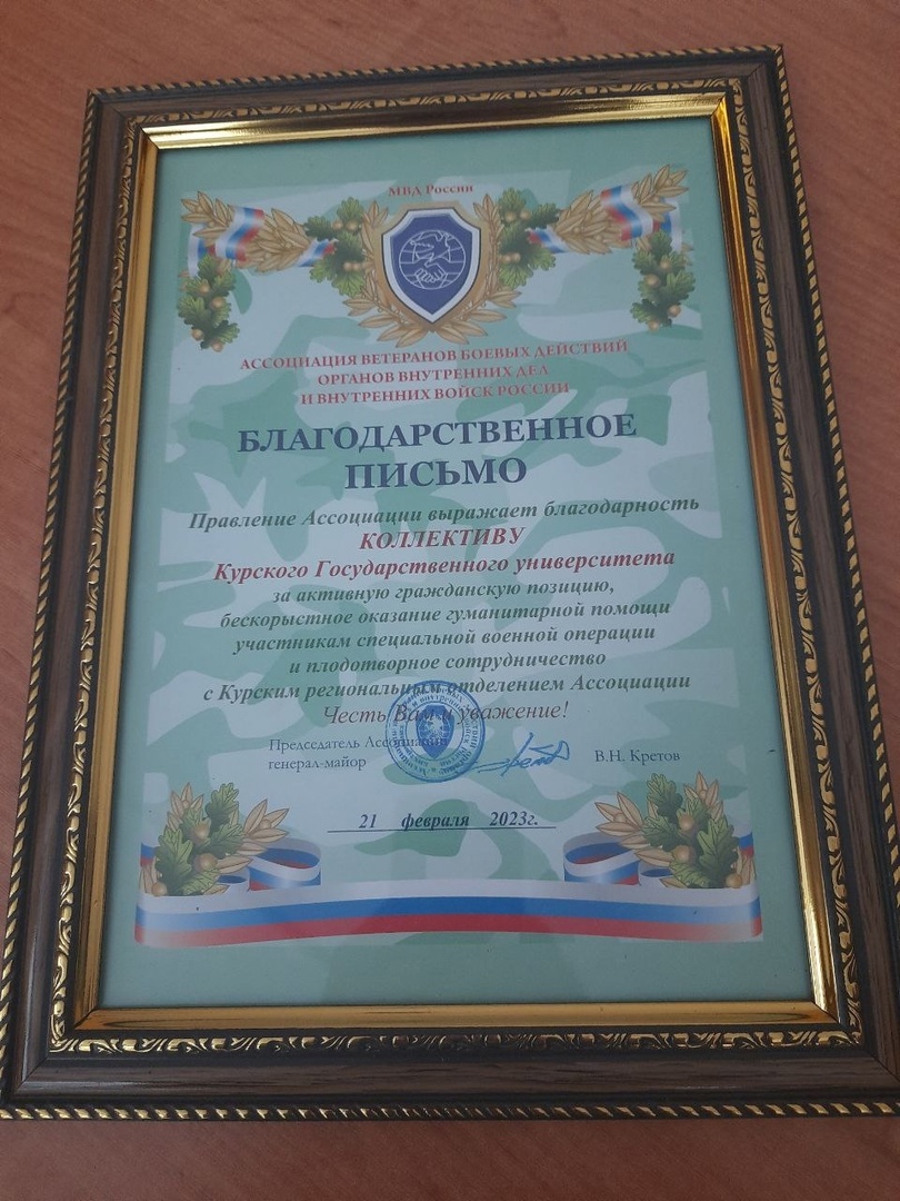 За активную гражданскую позицию и сотрудничество с Курским региональным отделением Ассоциации ветеранов боевых действий ОВД и ВВ России коллектив Курского государственного университета был награжден Благодарственным письмом председателя Ассоциации генерал-майора В.Н. Кретова.