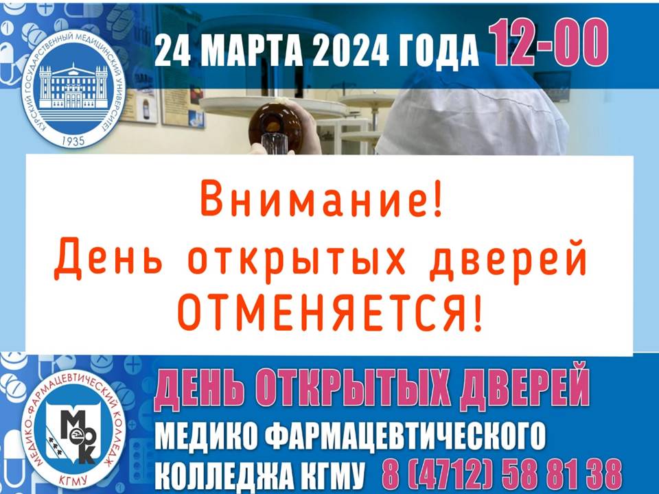 В связи с трагическими событиями в «Крокус Сити Холле» День открытых дверей медико-фармацевтического колледжа 24 марта 2024 г. ПРОВОДИТЬСЯ НЕ БУДЕТ.