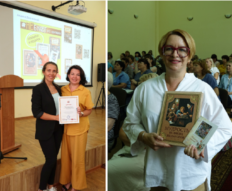 Грамоту победителя и сертификат на литературу для семейного и детского чтения, методических изданий для педагогов передали заведующей организацией Алле Климовой. А книгу «Мудрость великих педагогов» получила кафедра дошкольного, начального образования и коррекционной педагогики Курского института развития образования, которая является партнёром и активным участником многих образовательных событий, организуемых методической службой издательства «Просвещение - Союз».