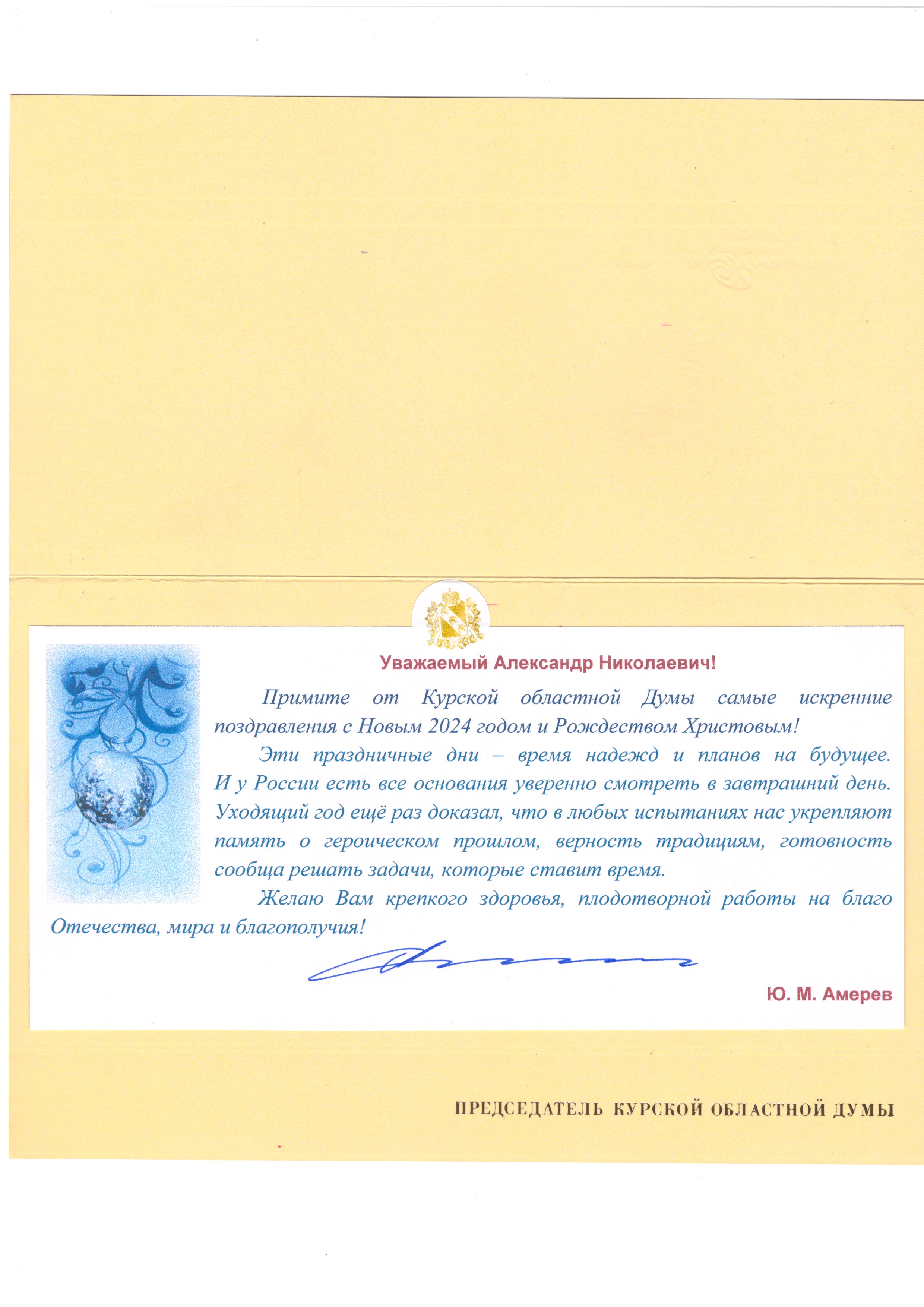 Поздравление председателя Курской областной Думы Ю.М. Амерева с наступающим Новым годом