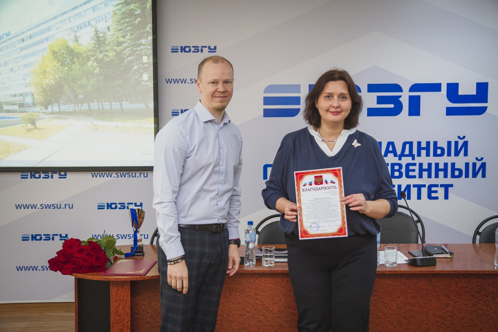 В Юго-Западном государственном университете 27 февраля прошел ученый совет. В начале заседания проректор по учебной работе ЮЗГУ Оксана Локтионова и проректор по науке и международной деятельности ЮЗГУ Дмитрий Титов наградили победителей фестиваля работающей молодежи «Юность-2023», призеров регионального этапа олимпиады по английскому языку «English in Use», а также отметили благодарностями от «Курской школы-интерната» и Министерства социального обеспечения, материнства и детства Курской области представителей факультета лингвистики и межкультурной коммуникации.