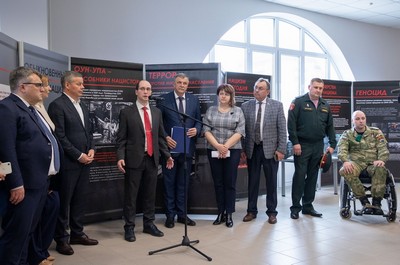 В Курском государственном университете открылась выставка «Обыкновенный нацизм», посвященная преступлениям украинских неонацистов на Донбассе. На открытии мероприятия присутствовал ректор КГМУ профессор Виктор Анатольевич Лазаренко и студенты нашего университета. Открытие посетили заместитель губернатора Виктор Николаевич Карамышев и врио председателя Правления Российского исторического общества Руслан Григорьевич Гагкуев.