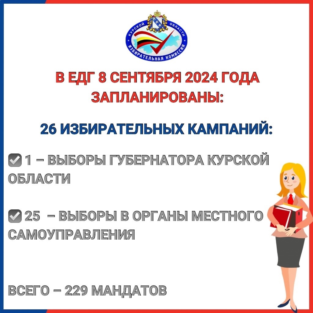 На единый день голосования 8 сентября 2024 года на территории Курской области запланированы избирательные кампании: 1 кампания регионального уровня и 25 – муниципального, по итогам которых предстоит распределить 229 мандатов.