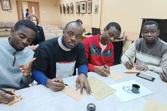 Посетителям музея показали интересный фильм о первых рукописных книгах, о долгой и кропотливой работе по их созданию. А затем предложили самим попробовать стать рукописцами - на специальной бумаге перьевыми ручками попробовать скопировать буквы из первой русской азбуки, написать своё имя, название своей страны. Иностранцы, приехавшие в Курск из Буркина-Фасо, Камеруна, Кот-д’Ивуара, Нигерии, Судана и Шри-Ланки, старательно выводили слова «Я люблю Россию» и «Это красивый музей». После такого экскурса в историю русского языка студенты ещё больше прониклись богатством культуры, выбранной для обучения страны.