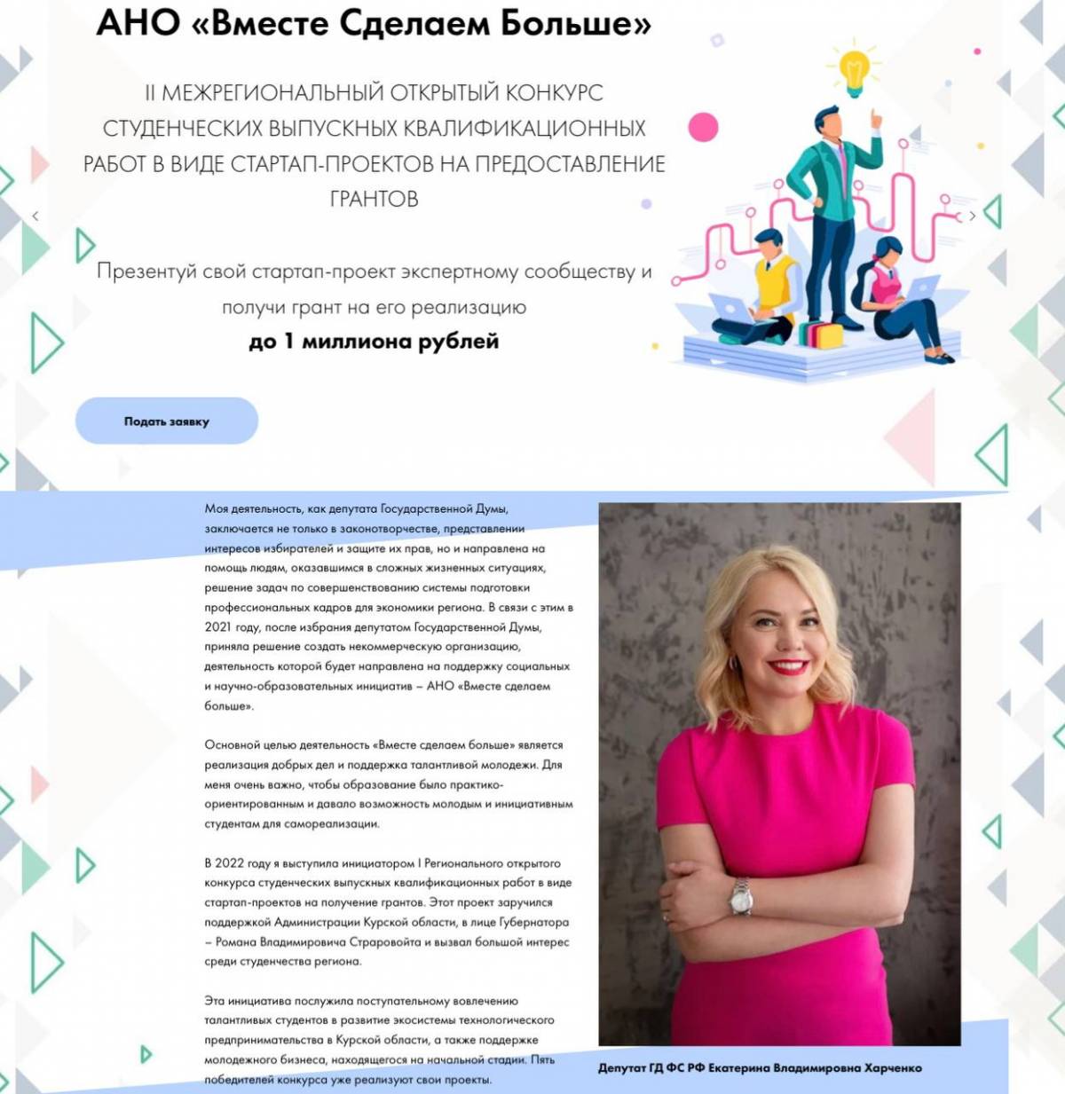 «Мы делаем добрые дела и поддерживаем талантливую молодежь. Запуская в 2022 году конкурс стартапов в Курской области, мы и не предполагали увидеть такой большой интерес со стороны студентов. Поэтому в этом году география конкурса расширена. Студенты любого вуза из всех регионов ЦФО (кроме Москвы и Московской области) могут подать заявку на участие и побороться за 1 миллион рублей! В этот раз будет 7 победителей», - сказала Екатерина Харченко.