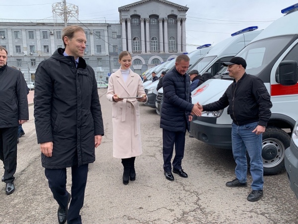 На Красной площади Курска он вручил ключи от новых машин скорой помощи. Курским медучреждениям передан 21 автомобиль.
