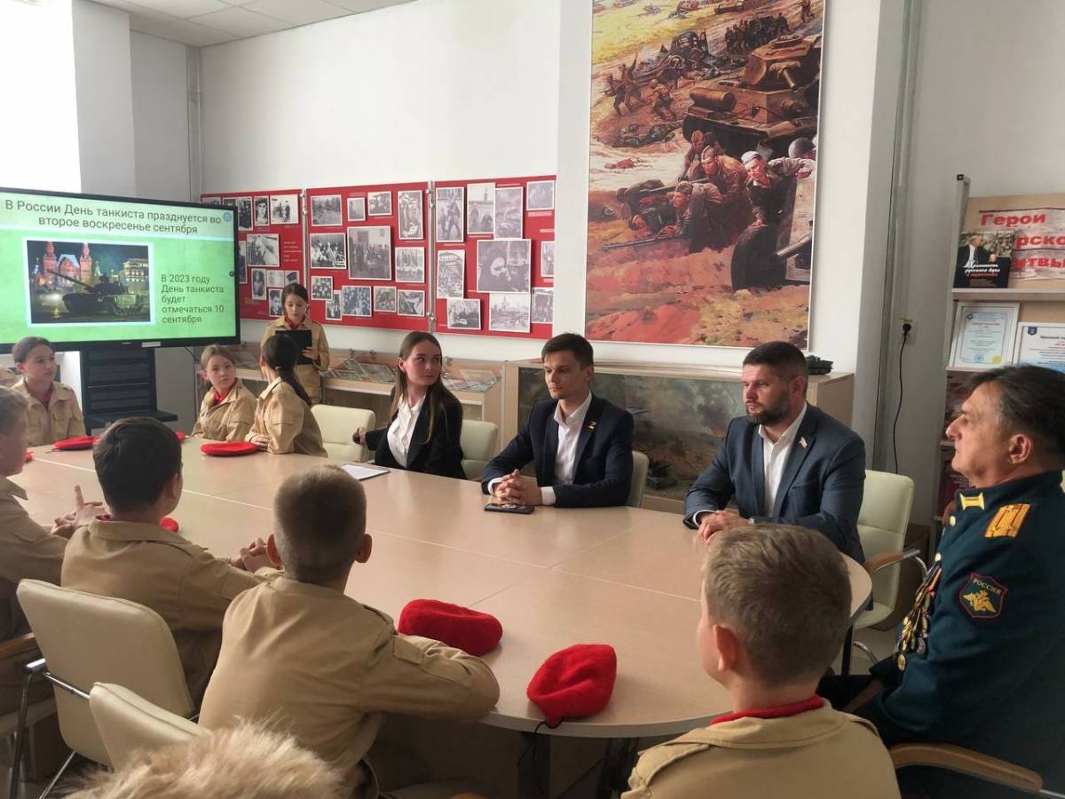 Депутат Курской областной Думы Сергей Меркулов и замруководителя регионального исполкома партии Александр Новиков организовали встречу юнармейцев средней школы №60 имени героев Курской битвы с танкистом Владимиром Домашовым .