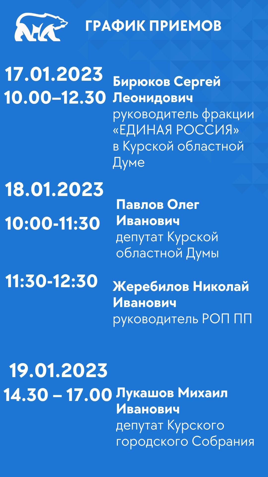 В Курской региональной общественной приёмной партии «Единая Россия» опубликовали график приёма граждан на январь 2023 года