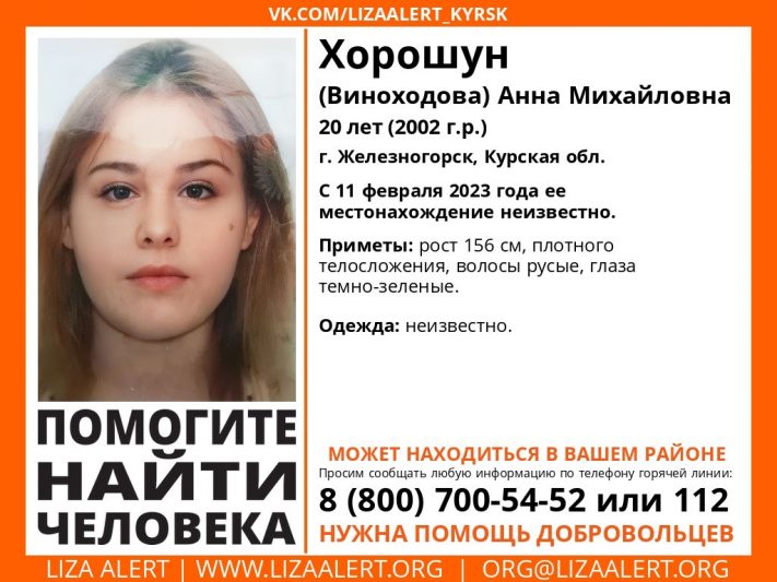 Поисковый отряд «Лиза Алерт» просит курян помочь с поисками пропавшей Хорошун (Виноходовой) Анны Михайловны. Девушка пропала 11 февраля, с тех пор её местонахождение неизвестно.