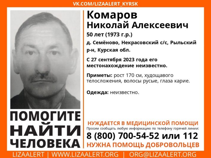 Пропал 50-летний Николай Алексеевич Комаров, который проживает в деревне Семеново Рыльского района.