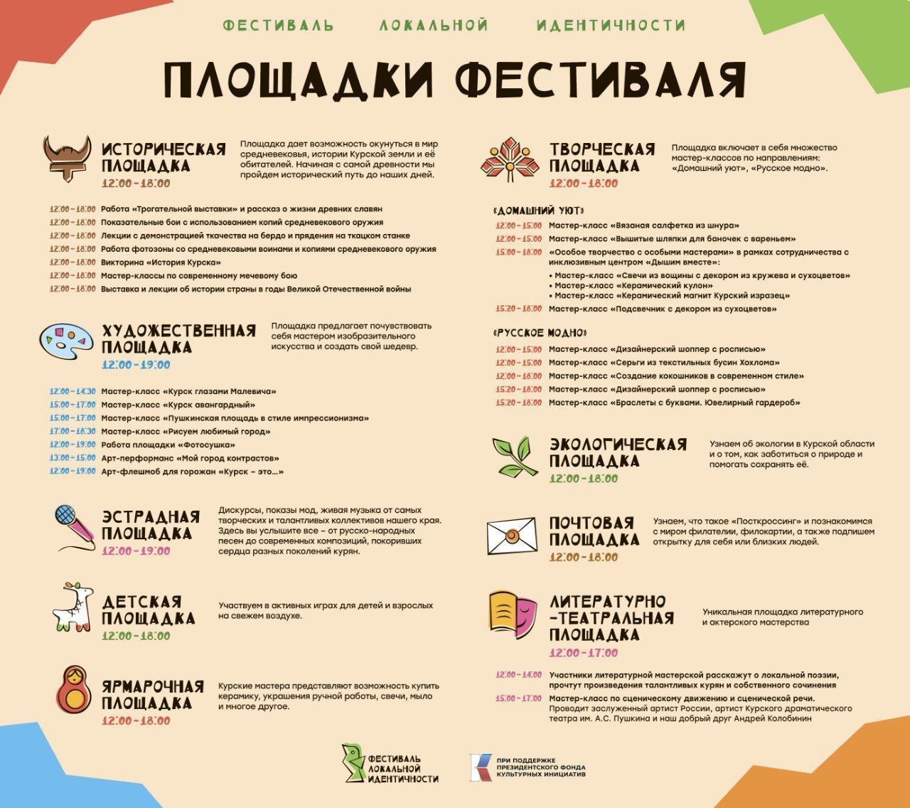 Сам фестиваль проводится при поддержке Президентского фонда культурных инициатив Центром поддержки молодежных инициатив города Курска и резидентами креативного пространства «Веранда». Гости мероприятия смогут посетить 11 площадок с выставками, креативными мастерскими, мастер-классами и многим другим, что позволит погрузиться в атмосферу культурного праздника.Время работы площадок: