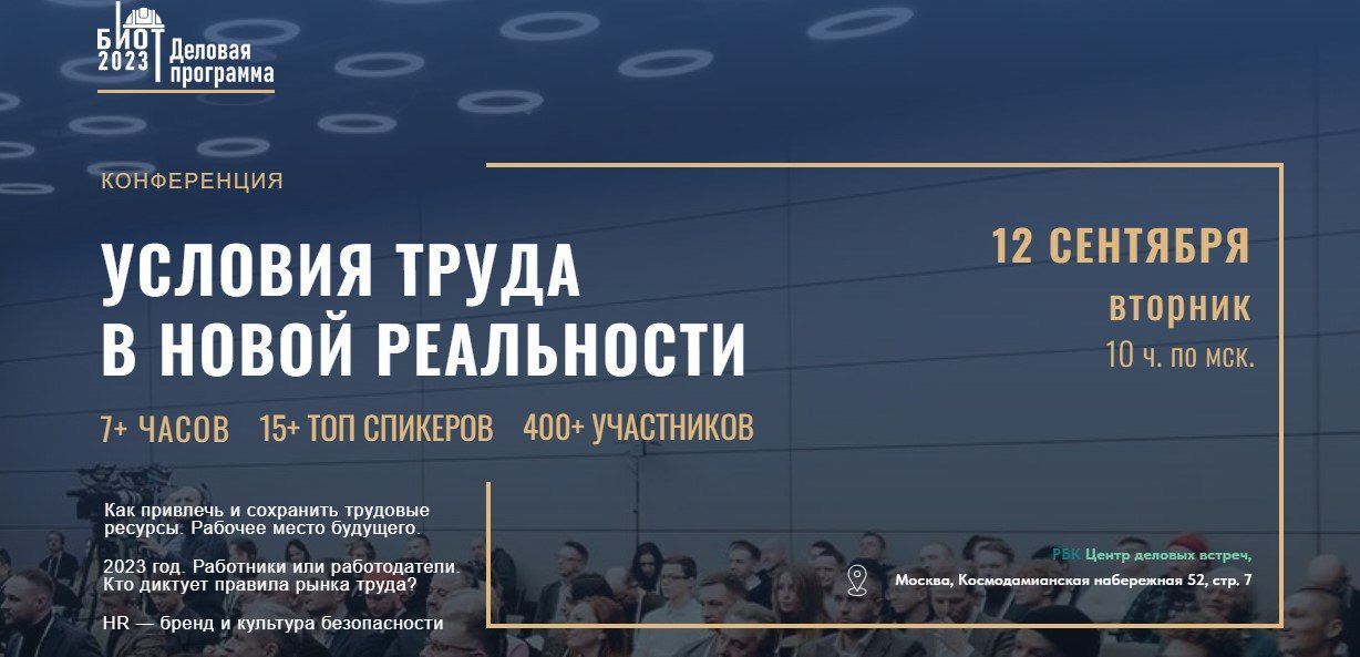 Мероприятие пройдет в Центре событий РБК (г. Москва) 12 сентября и является частью экосистемы событий Международной выставки и Форума «Безопасность и охрана труда» (БИОТ-2023),