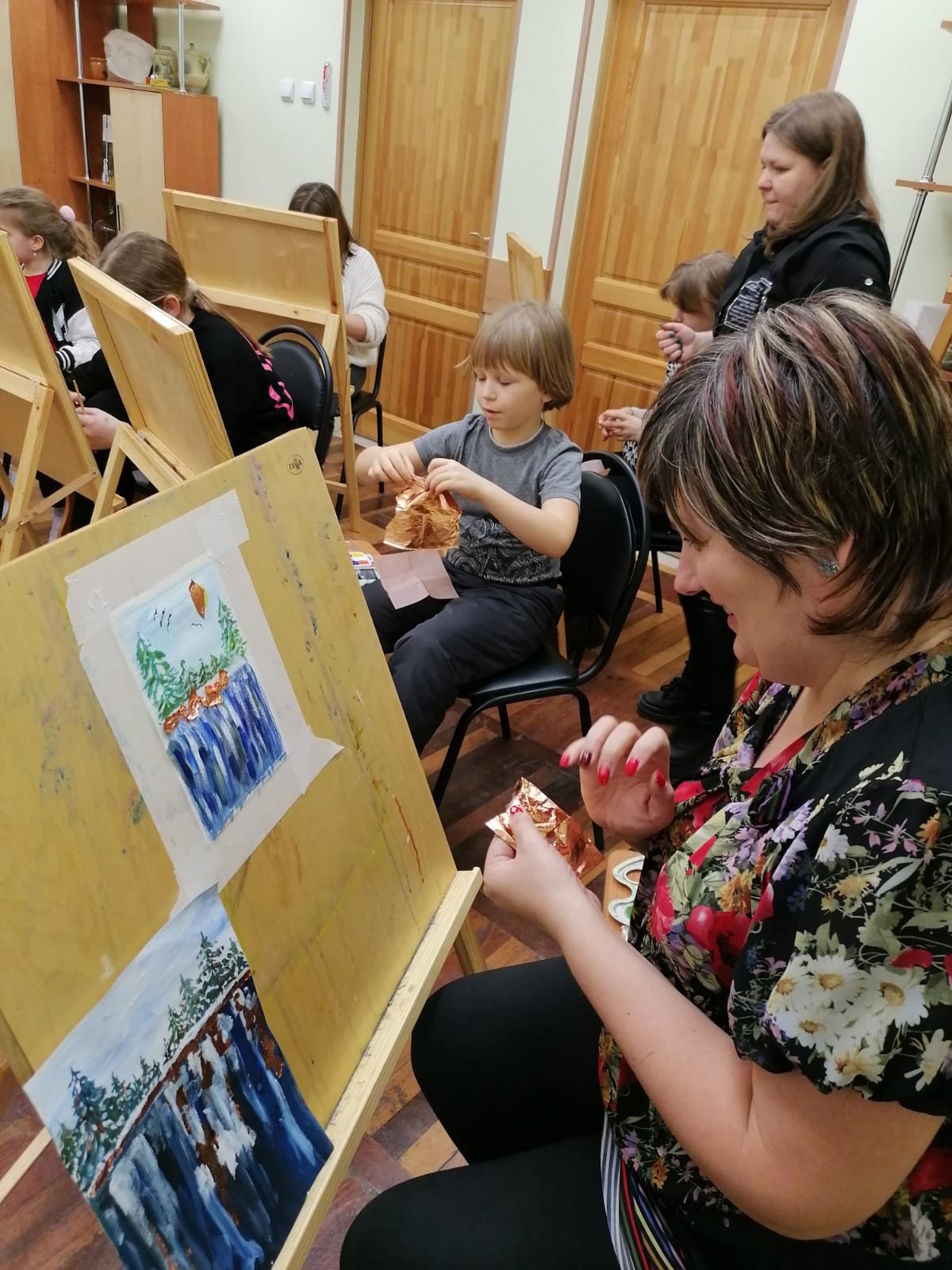 Заведующая отделением «Живопись» Мянянкина Юлия Валерьевна познакомила участников мастер-класс с поталь и научила как, можно ее использовать при изображении пейзажа. Все работы участников мастер-класса получились очень красивыми и оригинальными.
