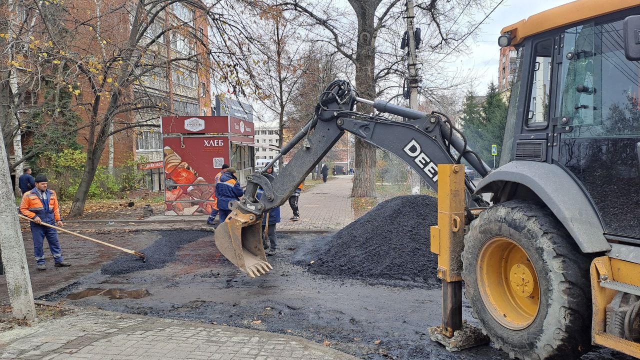 Ранее на ремонтируемом участке демонтировали бортовой камень, обновили асфальт на тротуарах и срезали старый асфальт с проезжей части. Сейчас уже установлены новые бордюры. Подрядчик восстанавливает тротуарную плитку, которую снимали для демонтажа бортового камня, а также обустраивает съезды.