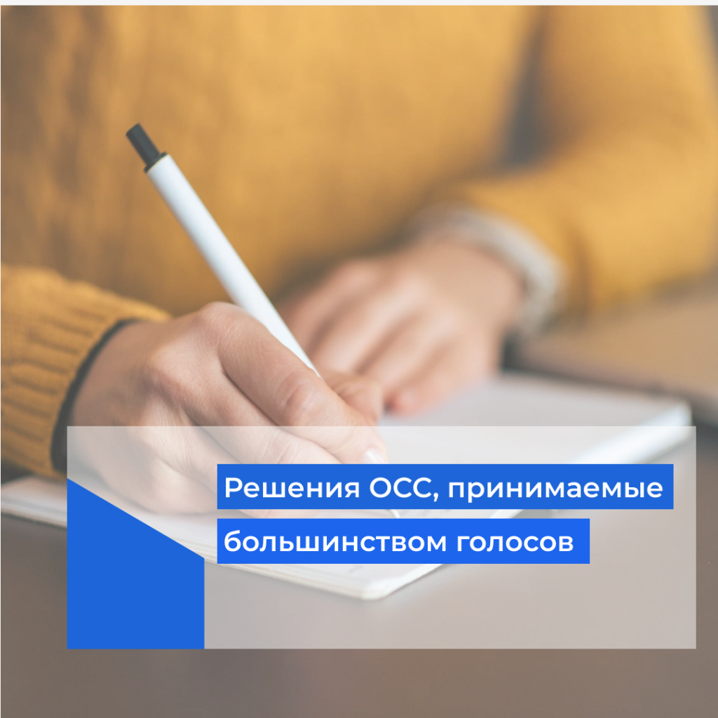 Решения общего собрания принимаются большинством голосов от общего числа голосов собственников — участников собрания по следующим вопросам (п. п. 2.1, 3.2 — 3.6, 4.1, 4.4 ч. 2 ст. 44, ч. 1 ст. 45, ч. 1 ст. 46, ч. 7, 9.2 ст. 156, ч. 3 ст. 161, ч. 1 ст. 161.1 ЖК РФ; п. п. 6.1.2, 6.1.3, 6.2 Правил, утв. Распоряжением Департамента информационных технологий г. Москвы от 27.02.2018 N 64-16-87/18):