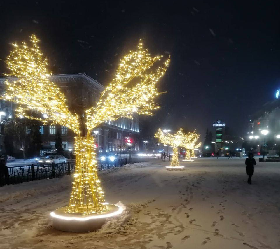 Накануне новогодних праздников областной центр украсили тематическими декорациями — на Театральной площади появились светодиодные деревья.