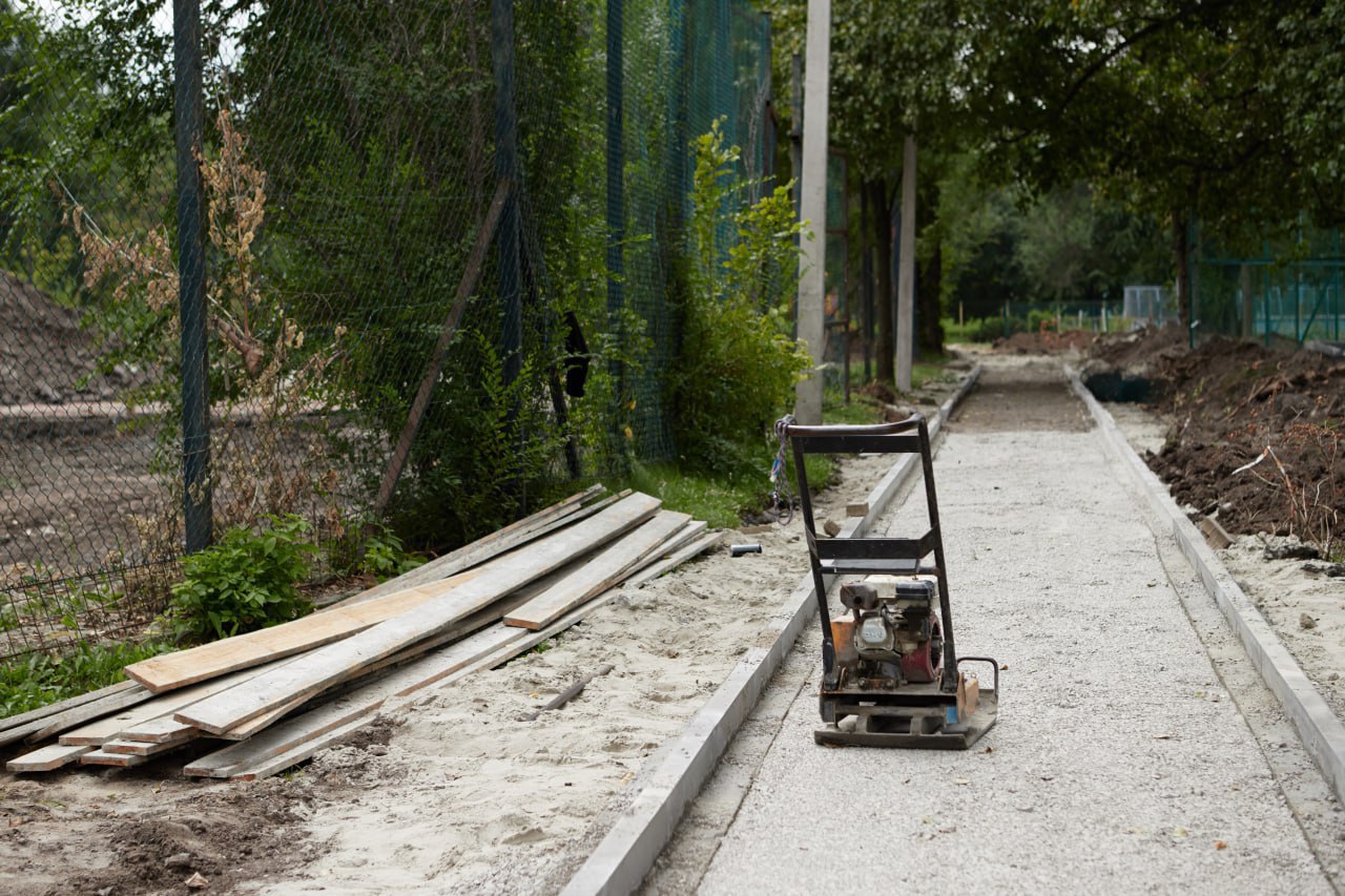 В Курске в парке на пересечении улиц Союзной и Куйбышева укладывают тротуарную плитку и обустраивают сеть электроосвещения.