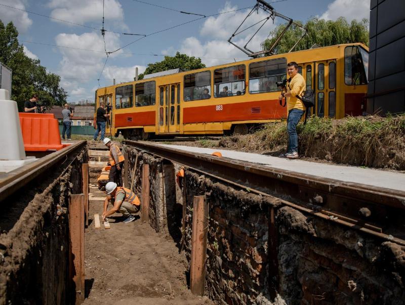 Сейчас идёт обновление участка между остановками «ЗАО «КПК» и «Восточное депо». Рабочие укладывают рельсошпальную решетку, трамвайные плиты и заканчивают сварку стыков рельсов.