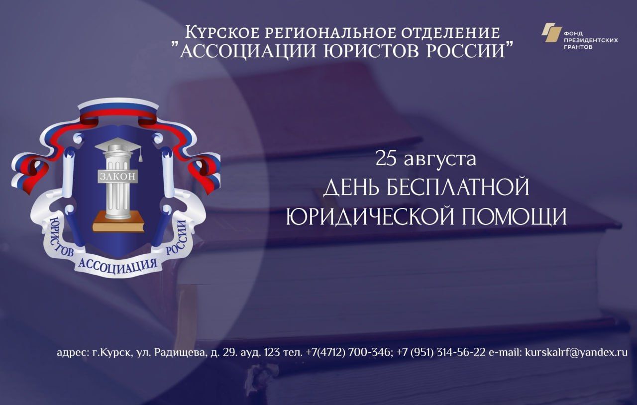 25 августа с 09:00 до 15:00 специалисты Государственного юридического бюро региона и Курского регионального отделения Ассоциации юристов России проведут прием граждан по вопросам земельных и наследственных правоотношений, взыскания задолженности, защиты прав потребителей и другим правовым темам. Мероприятие проводится при поддержке Фонда президентских грантов.