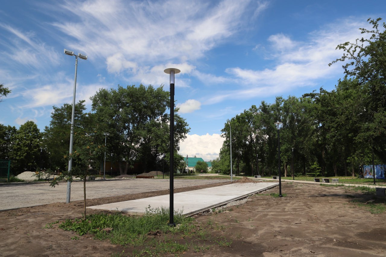 Рабочие устанавливают бортовой камень и мостят дорожки тротуарной плиткой. В общественном пространстве определены контуры площадок, забетонировано основание площадки для игры в настольный теннис и теннисного корта.