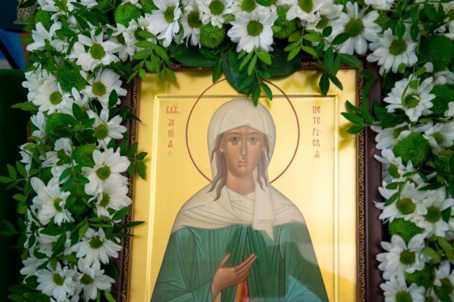 Сует ы земн а го мира отв е ргшися, крест жити я безд о много при я ла ес и . Скорб е й, лиш е ний, людск а го осме я ния не убо я лася ес и , любовь же Христ о ву позн а ла еси, е юже ныне на небес и услажд а ешися; Кс е ние блаж е нная богом у драя, мол и ся о спас е нии душ н а ших .