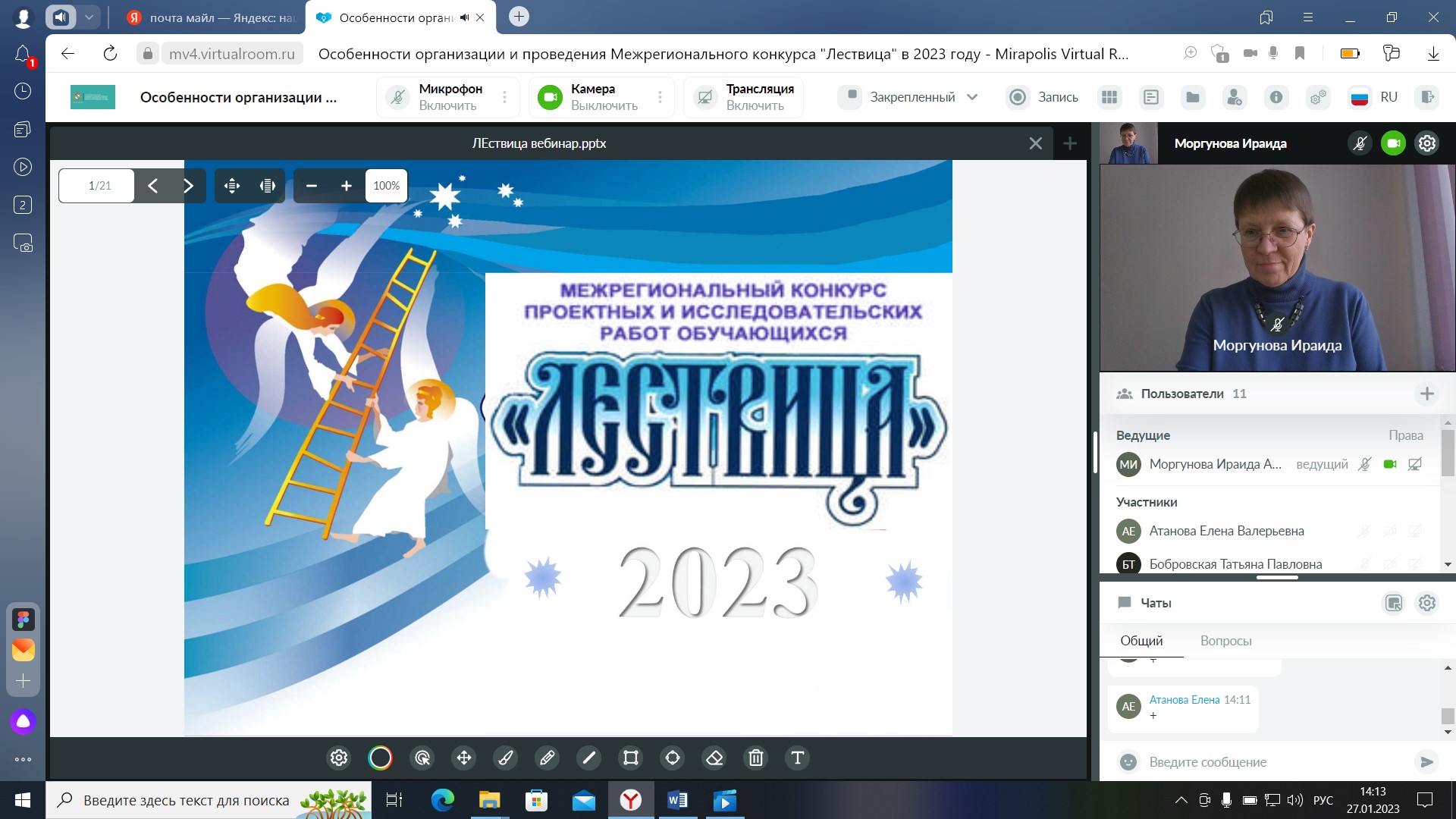 К вебинару присоединились 72 педагога из различных образовательных организаций Курской области. Сотрудники отдела сопровождения конкурсной деятельности КИРО Татьяна Валерьевна Иволгина и Ираида Алексеевна Моргунова познакомили участников вебинара с особенностями организации и изменениями в положении конкурса в 2023 году.