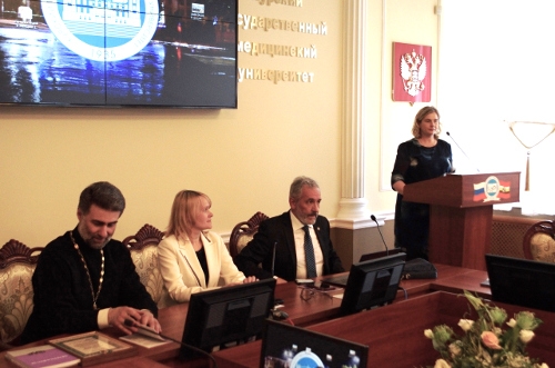 В своем приветственном слове проректор по воспитательной работе и связям с общественностью, к.психол.наук доцент Алеся Анатольевна Кузнецова отметила, что «в Курском государственном медицинском университете сильны традиции патриотического воспитания молодых людей, а тема круглого стола напрямую выходит на профессиональную деятельность наших пока еще студентов. Выпускники КГМУ должны обладать высокой культурой, богатым духовно-нравственным потенциалом, знать и любить историю своей страны, любить людей и любить свою специальность. В нашей истории, философии, медицине немало героев, которые до конца были верны своему долгу, своему призванию и о них тоже нужно знать».