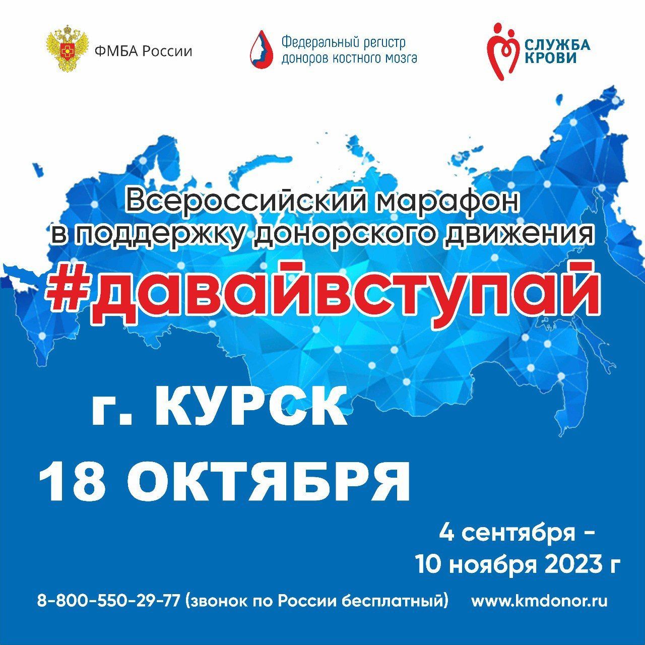 — 14.00-15.00 — интерактивная лекция «Я могу. Я должен. Я — донор Костного мозга» в Курском государственном медицинском университете. Участие примет спикер от Федерального регистра Наталья Малышева.