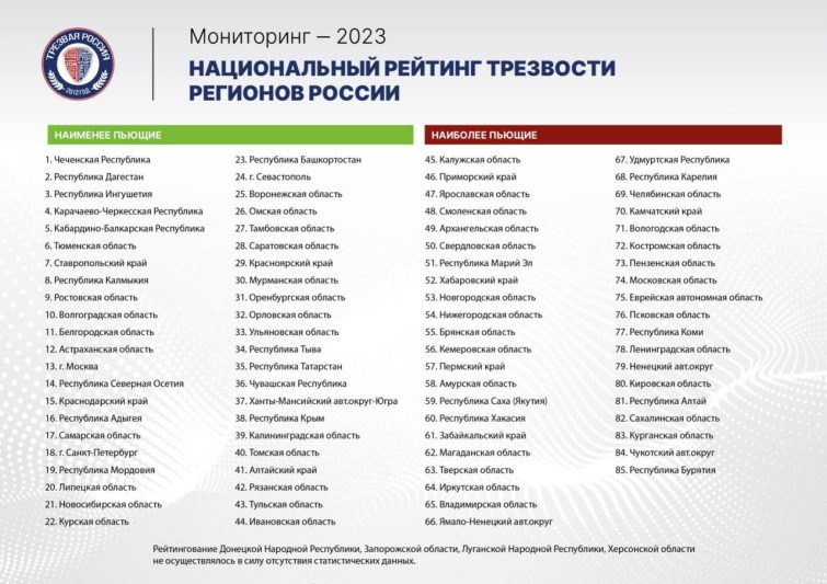 Самыми «трезвыми», по оценкам специалистов, стали Чеченская Республика, Дагестан и Ингушетия, а замыкают рейтинговую таблицу Курганская область, Чукотский автономный округ и Республика Бурятия.