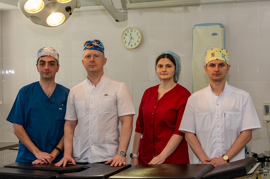 Хирург Илья Асеев, ординатор Роман Мальцев, анестезиолог Дмитрий Биба, операционная медсестра Надежда Гуторова и медсестра-анестезист Виктория Миндрик провели очень сложную операцию. Она длилась шесть часов, но им удалось спасти пациента.