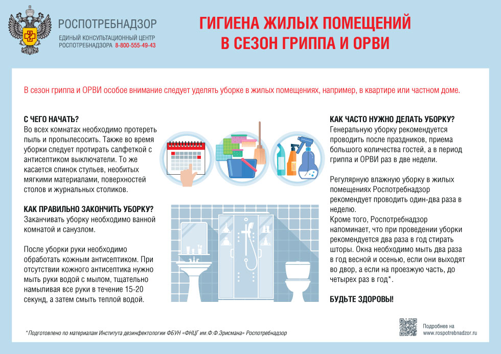 В сезон гриппа и ОРВИ уборке в жилых помещениях следует уделять особое внимание. Генеральную уборку рекомендуется проводить после праздников, приема большого количества гостей, а в период гриппа и ОРВИ раз в две недели. Регулярную влажную уборку в жилых помещениях Роспотребнадзор рекомендует проводить один-два раза в неделю.