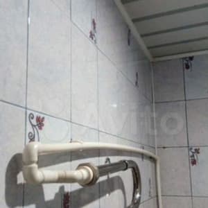 На кухне остался гарнитур, холодильник. Пол линолеум. Потолок пластик. Кафель на стенах почти убран для замены.